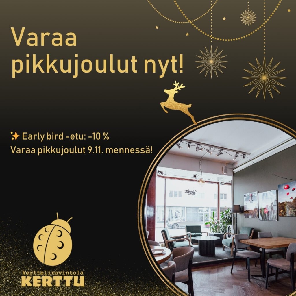Varaa paikkasi Kertun legendaarisiin pikkujouluihin ja nauti tunnelmallisesta illasta täynnä makuja, musiikkia ja pelejä – nyt 10 % Early Bird -edulla!